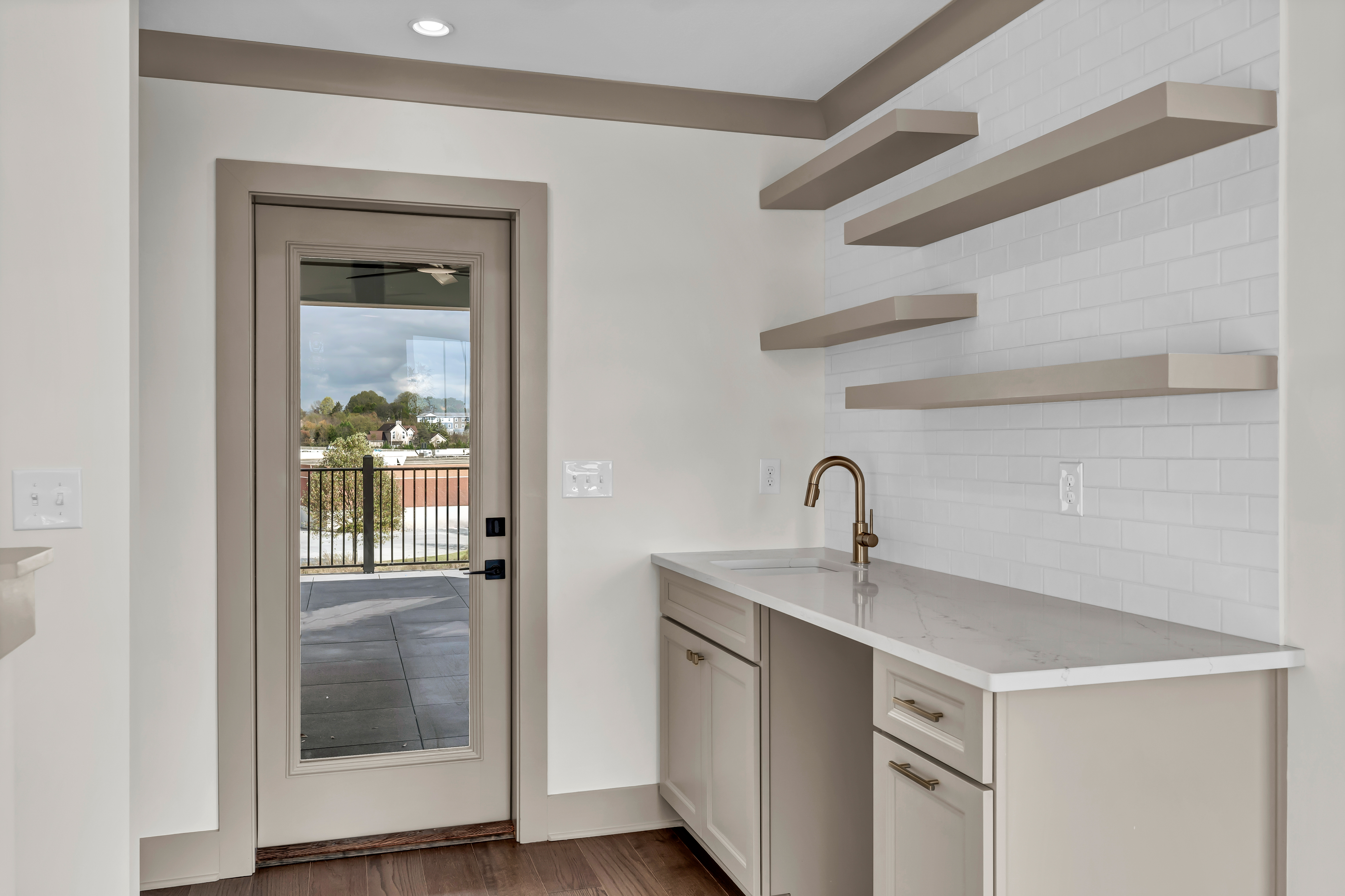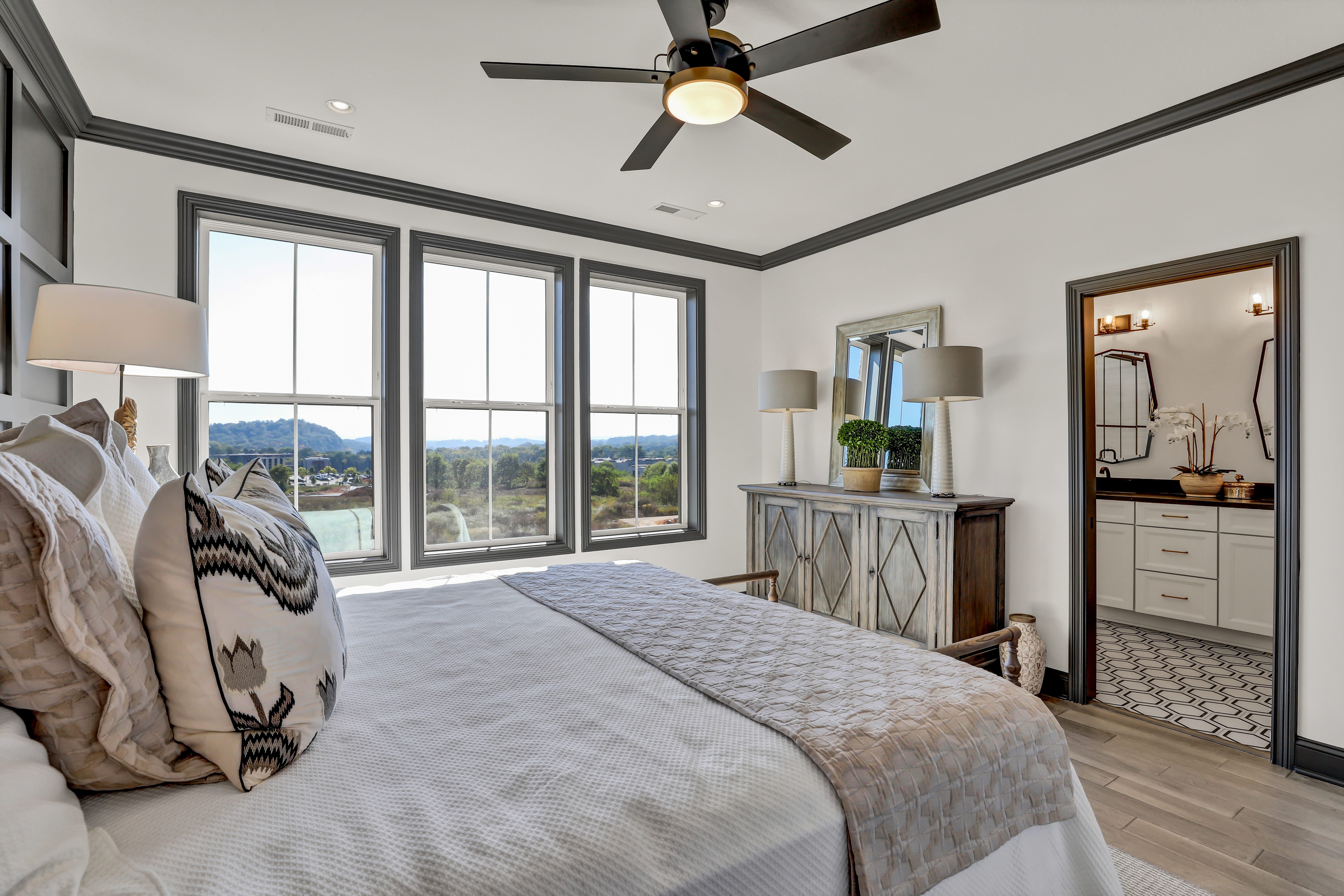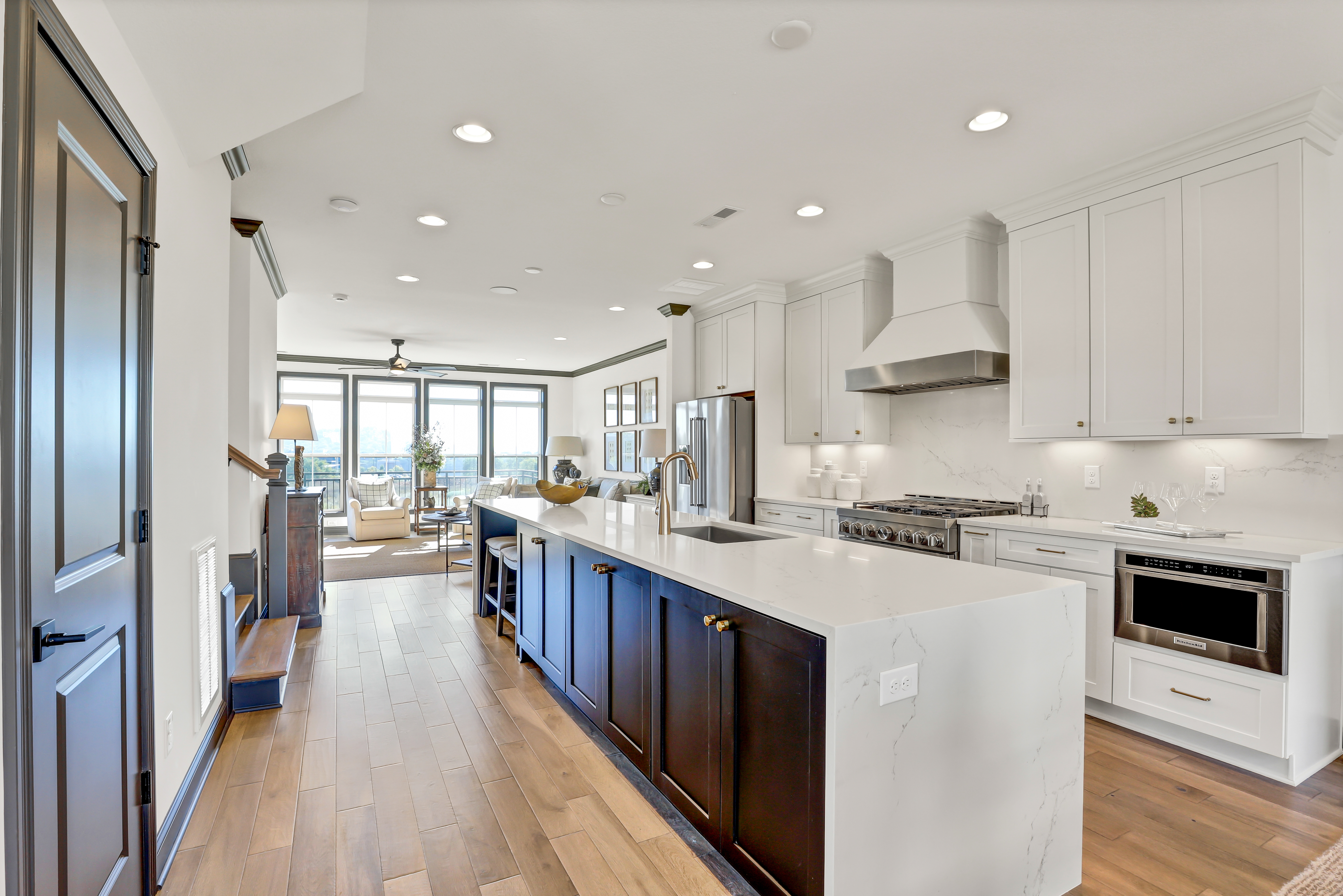 The Kensington is the result of a collaborative effort between Saddlebrook and one of the nation's top new home architects. This urban townhome with a full-brick exterior offers an unparalleled level of flexibility in floor plan design. The lower level offers a spacious two-car garage, storage, and flex room – perfect for an office, home gym, or in-law suite. The main level is a sight to behold, featuring a stunning open-concept design illuminated by expansive windows that bathe the kitchen, dining area, and great room in natural light. The designer kitchen is complete with an eat-in island that stretches over 14 feet in length and a grilling deck for meal preparation. The second level consists of three bedrooms and two bathrooms, with an option for two full-sized master suites. The master suite’s bathroom has an immaculately tiled, oversized walk-in shower. On the third level, you'll find a sky den and a covered rooftop deck, offering breathtaking views of the majestic Smoky Mountains.